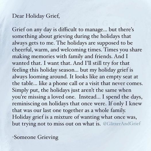 The loss of a loved one makes every day a roller coaster of emotions whether up or down, good or bad. The Holidays bring a different kind of melancholy feeling of emptiness that can be difficult to maneuver this time of year. The first thing I learned in my loss was that everyone grieves differently, and however someone chooses to grieve they deserve love and support regardless.